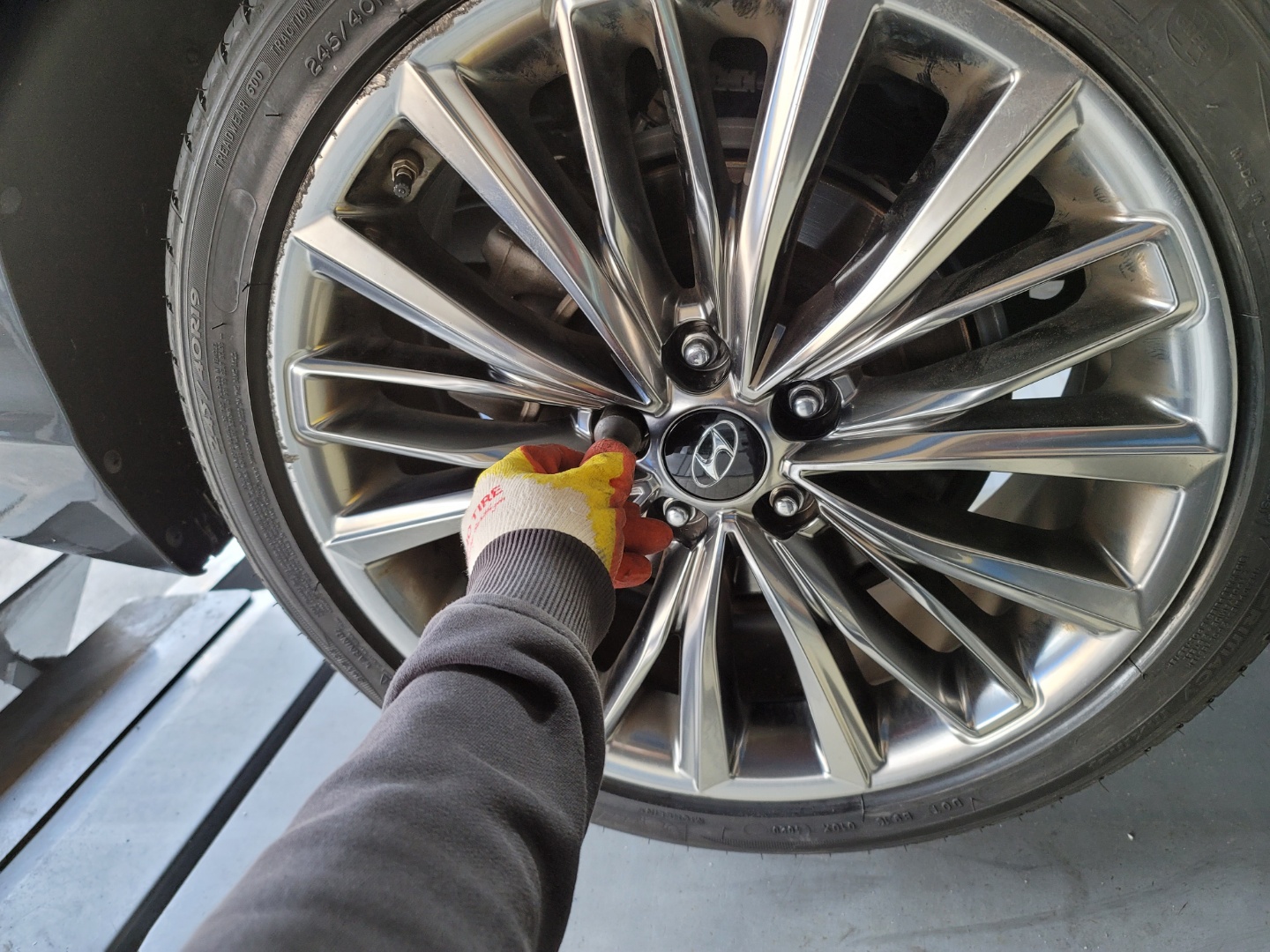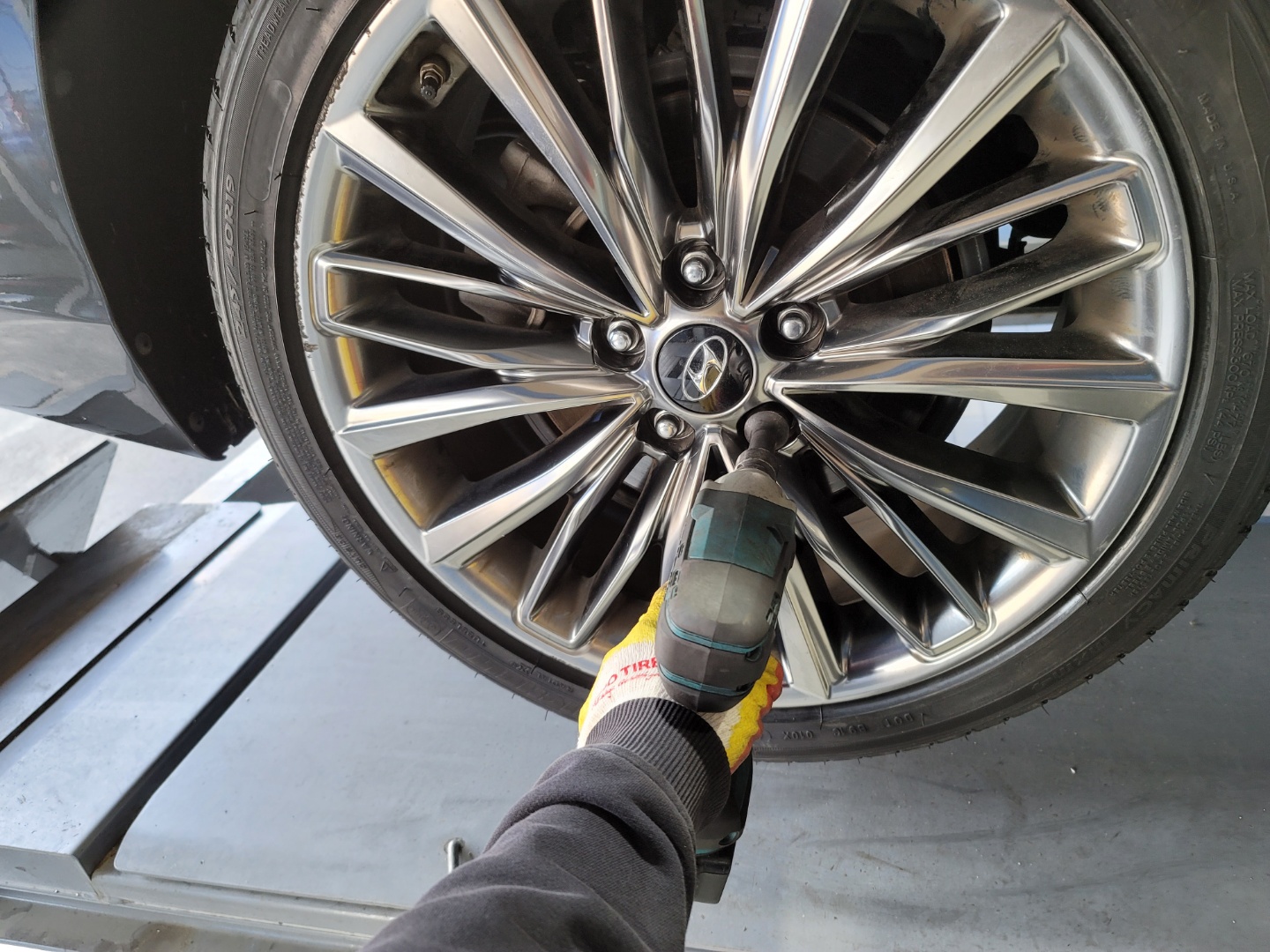 타이어 교체 및 휠 밸런스 작업 끝내고 휠타이어를 차량에 장착합니다.