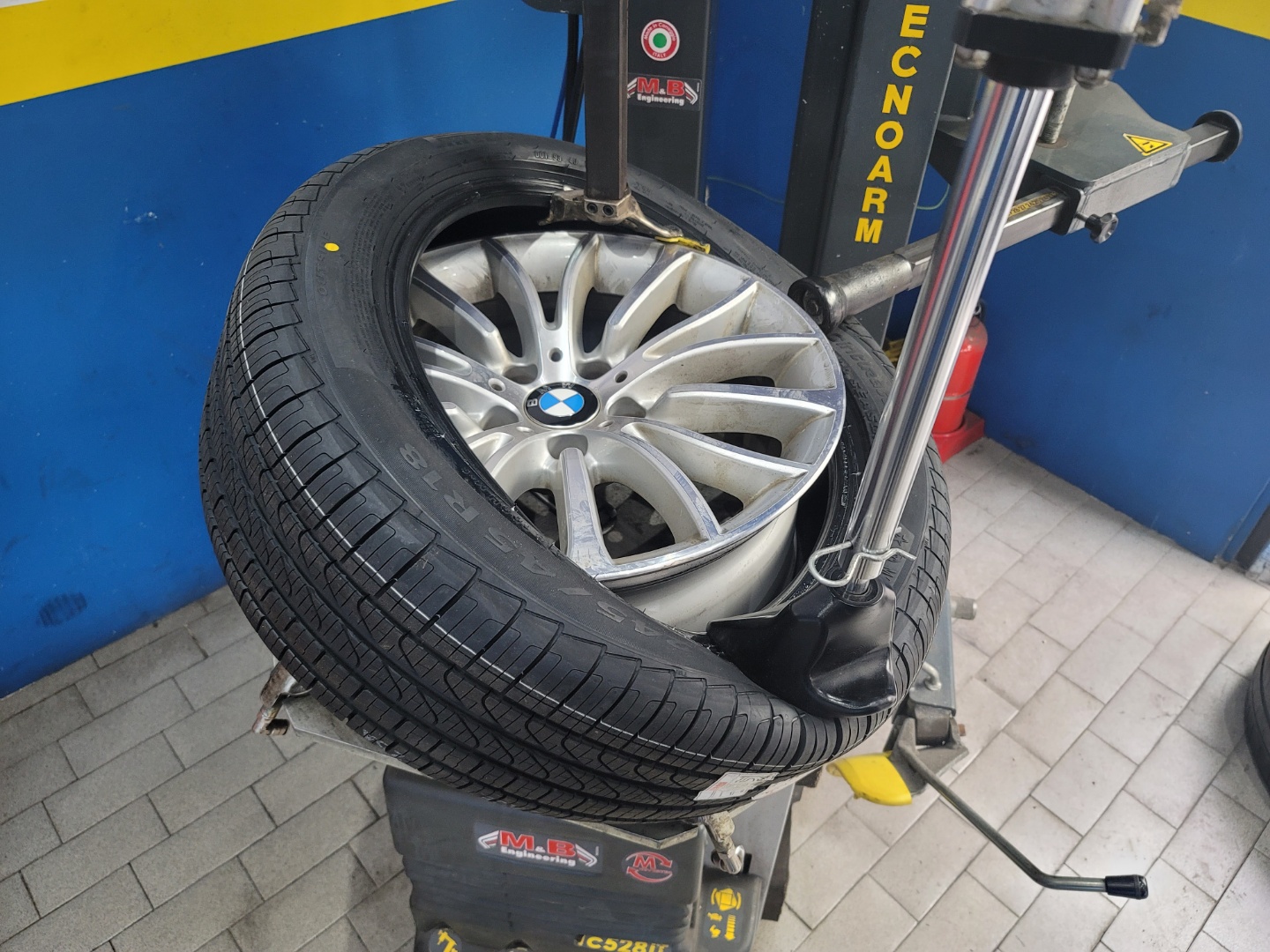 타이어 교환을 위해 이태리 M&B 탈착기를 이용하여 안전하게 탈착을 진행하고 있습니다.